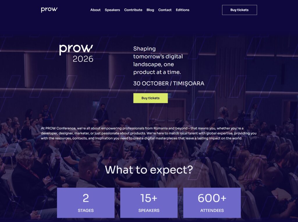 Pick: Prow Conference (Timisoara) – strong dev / startup / product crowd, with early-bird tickets typically cheaper if bought ahead. Prow