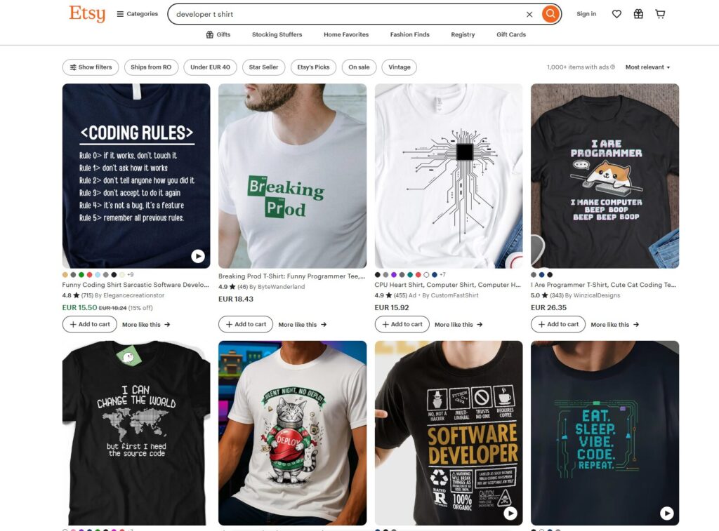 Pick: Minimal dev tee from Etsy – soft cotton, neutral colors, inside-jokey print. To keep it budget-friendly, filter by price & reviews.