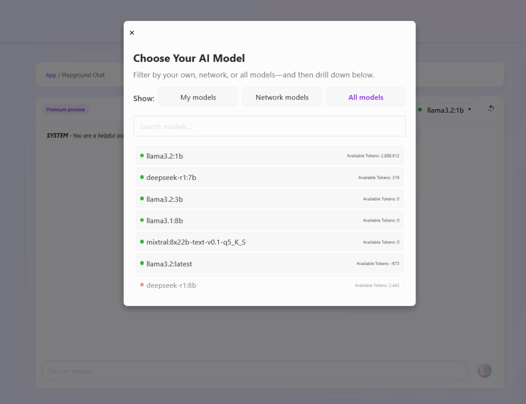 Easily discover every AI model available in your network. Simply click the top-right corner within chat to see: